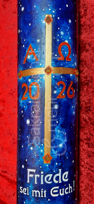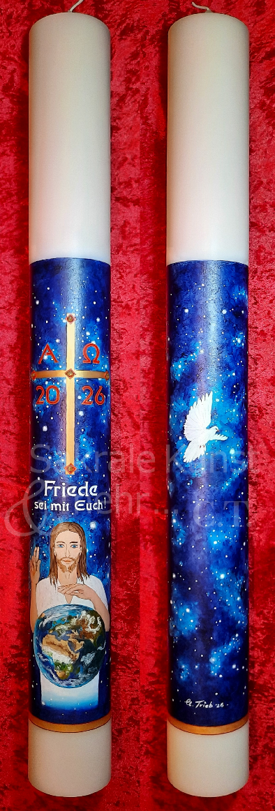 Es ist wieder soweit. Die neue Osterkerze - rundum handbemalt von Claudia Trieb - steht in der katholischen Kirche St. Ulrich in Königsbrunn. Die zehnte ihrer Art in Folge zeigt eine klare Botschaft. "Friede sei mit Euch!"