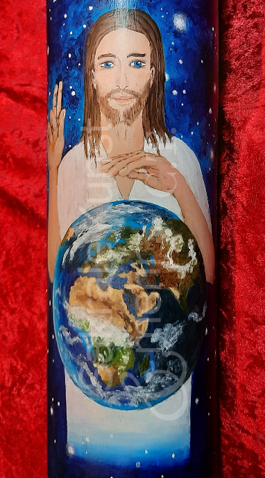 Zu seinem Friedensgruß "Friede sei mit Euch!"segnet Jesus Christus mit seiner Rechten den Betrachter und die ganze Welt. Seine linke Hand hält er schützend, und bewahrend über die von Kriegen und Zerstörung gepeinigte Erde.